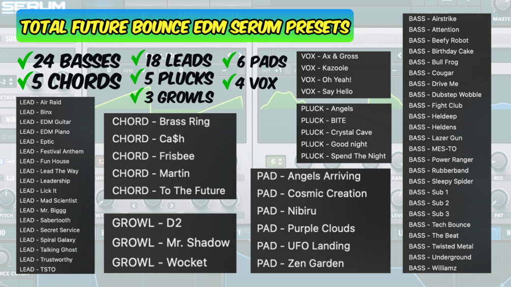 ✅ 65 High-Quality Professionally Designed Xfer Serum Presets - Inspired by FUTURE BOUNCE - 24 Basses + 5 Chords + 18 Leads + 5 Plucks + 3 Growls + 6 Pads + 4 Vox